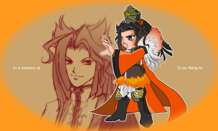 | 松の内が過ぎたらソソ様の命日がやってくるってんで ‘あいどるぱんち’オンステージ!な感じで。 当時は未所有の御仁でしたゆえ、 まいさんにカードを借りてにらめっこしながら描きました。 見えてる上半身は結果的に袖で隠れるわ 下半身は捏造しなきゃらなんわで 結構泣きの入ったイラストです。 イメージアイテムは猫耳ときしめんと羽。 周りのオレンジは外した状態で載せたかったのですが 統合したものか、別々に描いた分(しかもバストショットの方は加工前)しか 残してなかった。しまったー。 イラストからは微塵も感じられませんが、 「In a memory of 〜」を配置してて少ししんみりした気持ちに。 ‘曹孟徳の思い出によせて’の意です。 (Photoshop5.5) |
