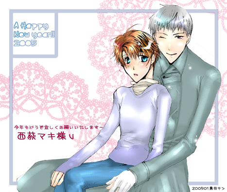 黒井テン様 『ごまにぎり@黒』の黒井テンさんより、2005年のお年賀に頂いたイラストですv 七条くんて頂き慣れていないので 初めて見た時、どっきりしました。 さすが七条くんだ…… 正月からほかほかだな、啓太。 お年賀用におすましさんした後は姫始めかと思うと おねーさん更にどっきどきです。 テンさんの、ほんわ〜っとした塗りや、覆い焼きの使い具合が好き(^^) 遅くなりましたが、こちらこそどうぞヨロシクお願いしますv *back*